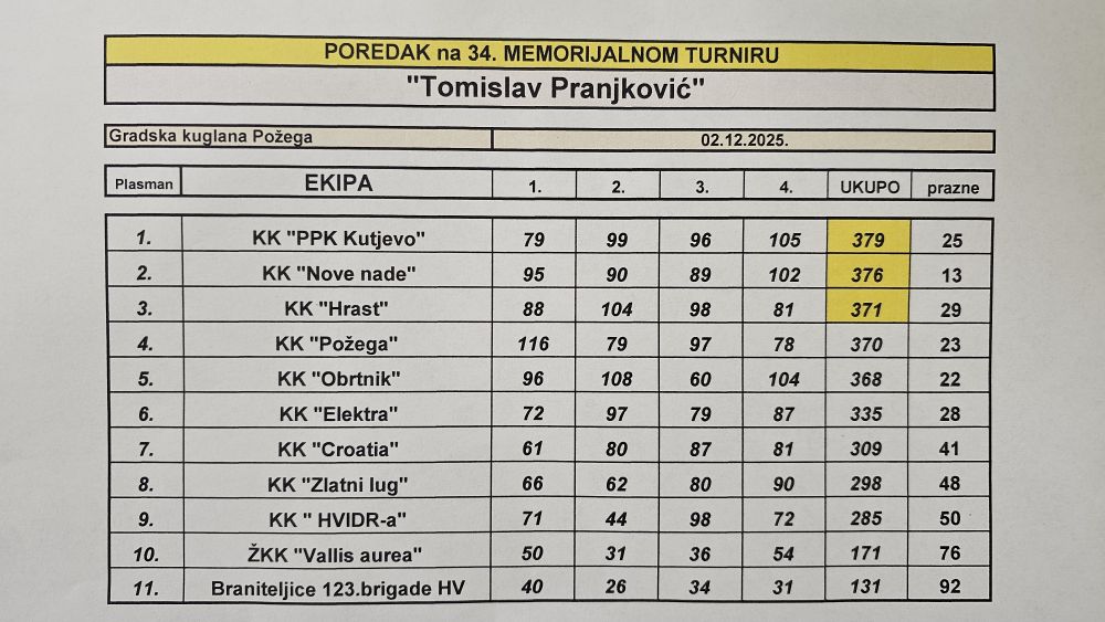 Na Gradskoj kuglani u Požegi 2. prosinca održan je 34. memorijalni kuglački turnir Tomislav Pranjković, u organizaciji HVIDR-e Požega i Kuglačkog kluba Obrtnik Požega te uz potporu Grada Požege. Turnir nosi ime po poginulom hrvatskom branitelju Tomislavu Pranjkoviću, koji je 2. prosinca 1991., zajedno s 10 svojih suboraca, stradao u neprijateljskoj zasjedi na bazi Papuk.