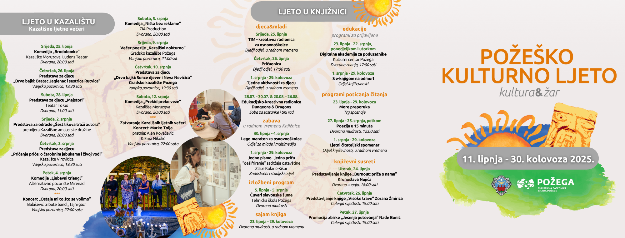 - Požeško kulturno ljeto nastaje kao sinergija – želja da objedinjeno i strateški ispričamo priču o gradu koji i tijekom ljeta živi punim plućima: kroz knjige, izložbe, kazališne predstave, filmove pod zvijezdama, koncerte i brojne sadržaje na trgovima, ulicama i u ustanovama. Naša je zadaća, kao Turističke zajednice, povezivati – sadržaje, ljude, institucije i ideje – i upravo to činimo i ovim programom. Cilj nam je približiti kulturu svim generacijama i učiniti ljeto u Požegi bogatijim, sadržajnijim i dostupnim svima – kako građanima tako i posjetiteljima koji sve češće biraju naš grad kao destinaciju. - istaknula je direktorica Turističke zajednice Mirna Šimunović Svoboda.