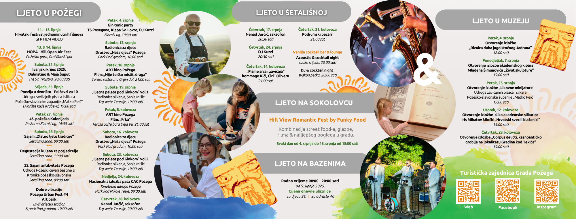 Ovog ljeta u Požegi očekuju nas brojna događanja na otvorenom – od koncerata, filmova, umjetničkih radionica i urbanih festivala do tradicionalnih sajmova i gurmanskih užitaka. Šetališna zona oživljava uz saksofon, tamburaše i DJ večeri svakog petka, dok nas Hill View Romantic Fest na Sokolovcu vodi kroz večeri uz street food i glazbu s najljepšim pogledom. Bazen Požega otvoren je svakodnevno za osvježenje i opuštanje, a „Ljeto u Požegi” nudi atraktivan program kroz cijeli lipanj, srpanj i kolovoz – za sve uzraste i ukuse.