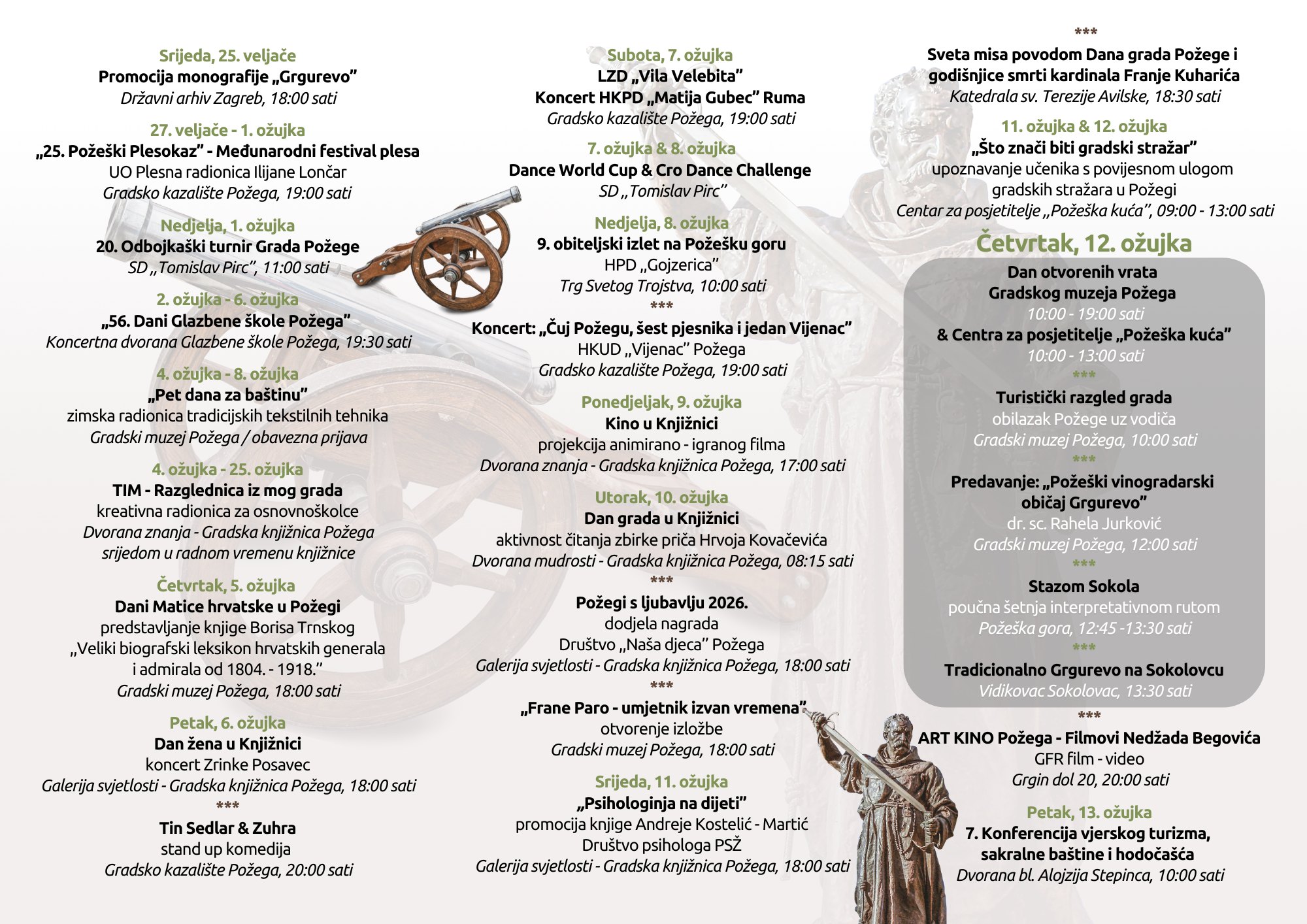 U četvrtak, 12. ožujka, Grgurevo će biti obilježeno Danom otvorenih vrata Gradskog muzeja Požega i Centra za posjetitelje Požeška kuća. Posjetitelje očekuju organizirani turistički razgled grada, stručno predavanje o požeškom vinogradarskom običaju te poučna šetnja Stazom Sokola na Sokolovcu.