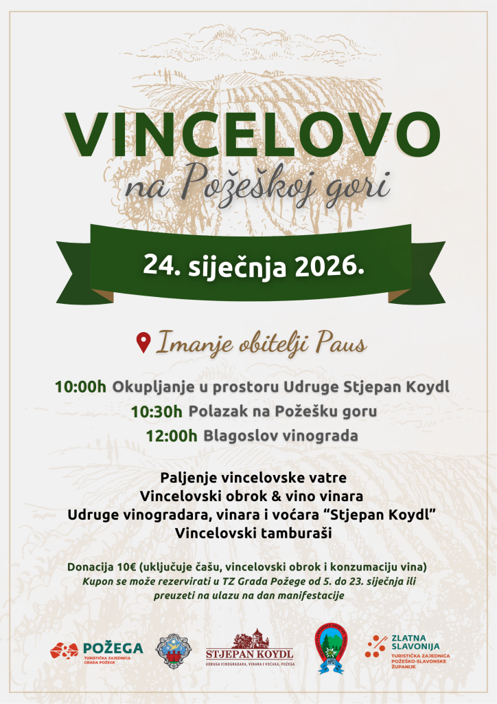 Požeška Udruga vinogradara, vinara i voćara „Stjepan Koydl“, u suradnji s Turističkom zajednicom Grada Požege i ove godine organizira proslavu Vincelova u vinogradu na obroncima Požeške gore, u neposrednoj blizini samoga središta grada. Manifestacija pod nazivom „Vincelovo na Požeškoj gori“ održat će se u subotu, 24. siječnja 2026. godine, na imanju obitelji Paus.