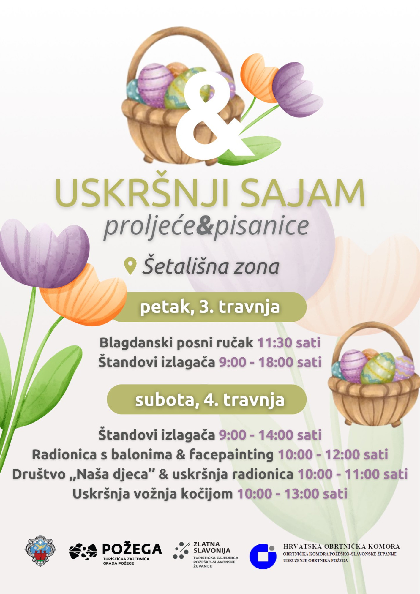 Organizatori pozivaju sve građane da posjete Uskršnji sajam, uključe se u prigodne aktivnosti te se pridruže podjeli posnog obroka i provedu blagdanske dane u ugodnom ozračju u središtu Požege.